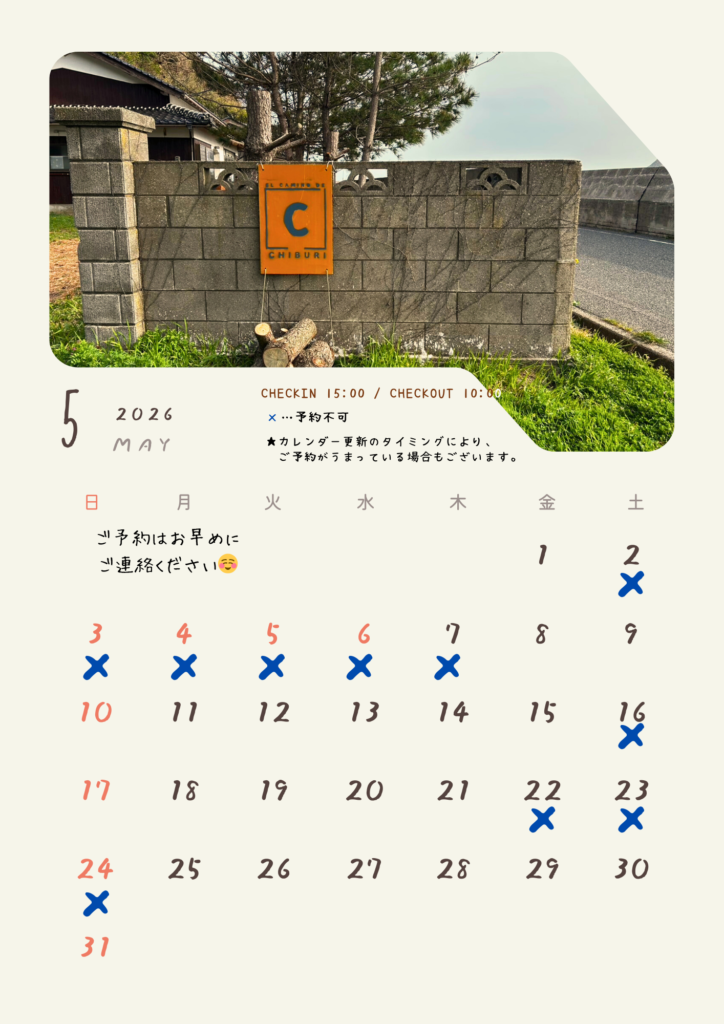 現在は、週末を中心に営業しております。ご予約カレンダーは、2か月前に更新します。